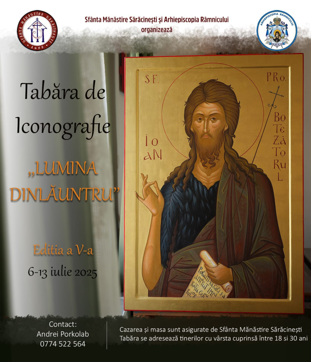 În perioada 6–13 iulie, într-un cadru liniștit și plin de tihnă, departe de agitația cotidiană, Sfânta Mănăstire Sărăcinești a găzduit cea de-a cincea ediție a Taberei de Iconografie. Anul acesta a fost diferit de cei anteriori, deoarece participanții au fost împărțiți pe două grupe, începători și avansați, pentru a fi cât mai folositor tuturor. Cele două grupe au avut coordonatori pe Andrei Porkolab (pictor) și Maria Isar (absolventă a facultății de Artă Sacră București).
